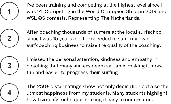 After coaching thousands of surfers at the local surfschool since I was 15 years old, I proceeded to start my own surfcoaching business to raise the quality of the coaching.